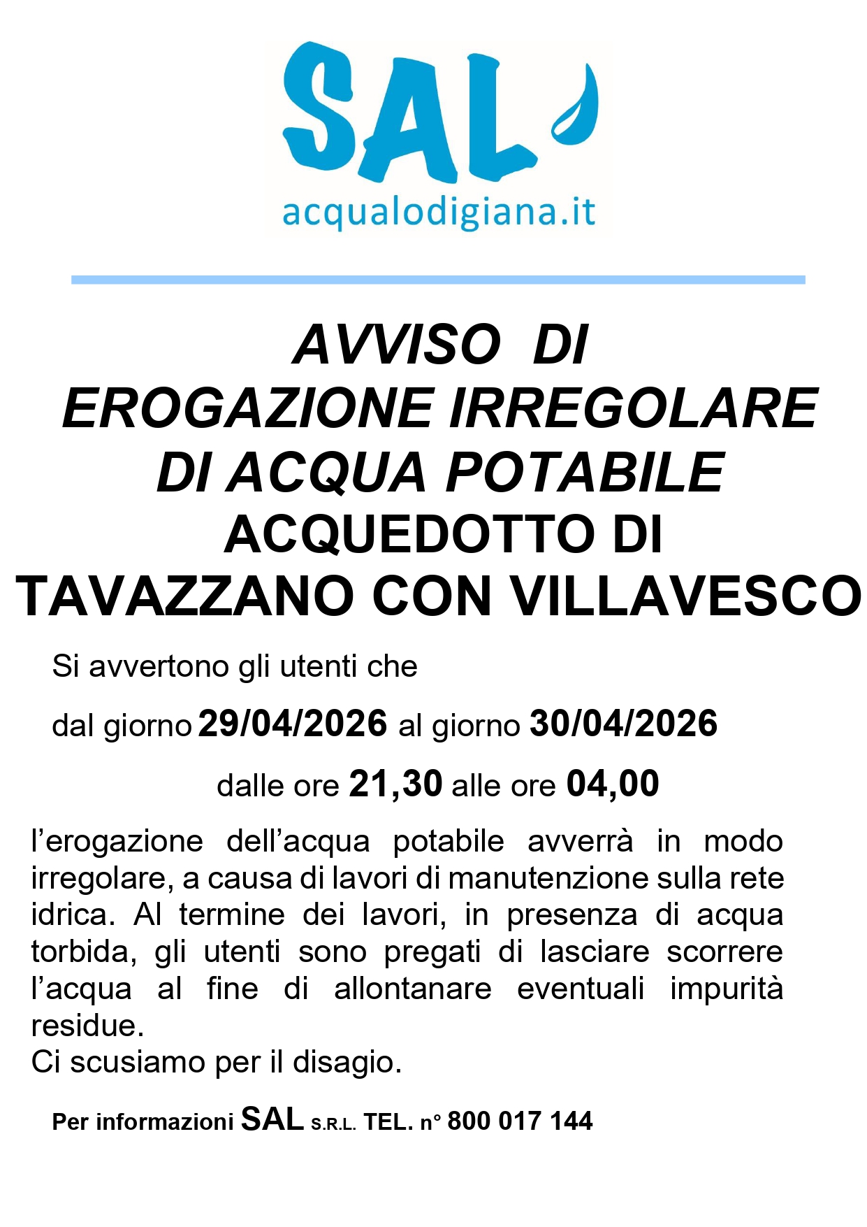 Si comunica alla cittadinanza che dal giorno 29/04/2026 al giorno 30/04/2026, nella fascia oraria che va dalle 21:30 alle 04:00,l'erogazione dell'acqua potabile avverrà in modo irregolare,a causa di lavori din manutenzione sulla rete idrica.